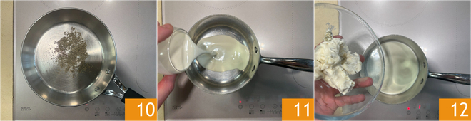 Faites torréfier le poivre moulu dans une poêle à feu doux pendant quelques minutes 10. Occupez-vous de la sauce : dans une petite casserole, versez la crème 11 et le gorgonzola 12.
