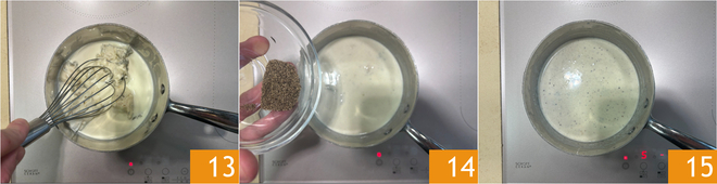 Mélangez au fouet 13 et assaisonnez avec les trois quarts du poivre torréfié précédemment 14. Vous devez obtenir une sauce épaisse et homogène 15.