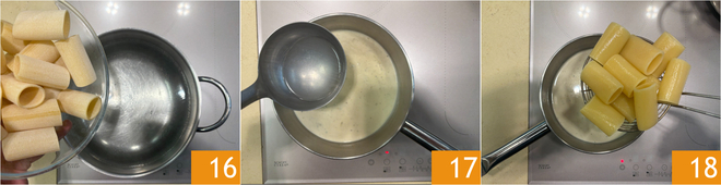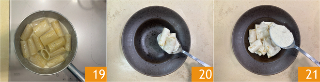 Il est temps de cuire les paccheri dans de l'eau bouillante salée 16. Transférez la sauce au gorgonzola dans une casserole plus grande ou une poêle et, si nécessaire, ajoutez un peu d'eau de cuisson 17. À 2 minutes de la fin, transférez les paccheri dans la sauce au gorgonzola 18.