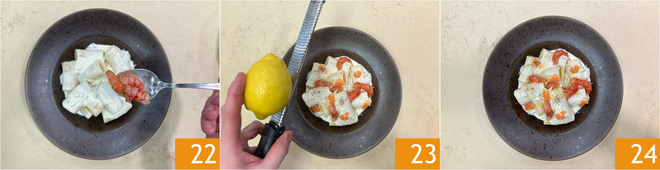 Terminez avec les crevettes rouges 22, le zeste de citron 23, quelques gouttes de la crème de crevettes et le reste du poivre torréfié. Les paccheri au gorgonzola et au poivre avec crevettes rouges sont prêts à être servis 24.