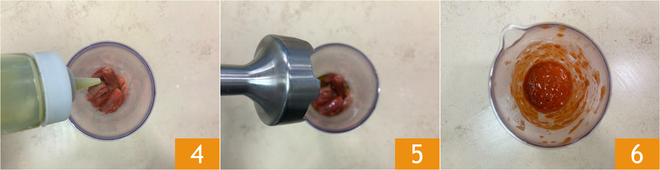 Assaisonnez avec l'huile 4 et mixez au mixeur plongeant 5 pour créer une émulsion 6.