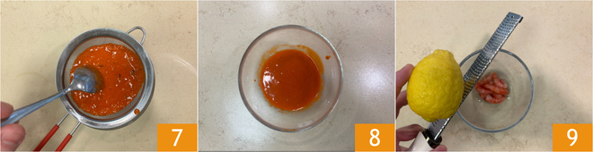 Dès que la consistance est lisse, passez le mélange au tamis 7 obtenant ainsi une sauce concentrée à la crevette rouge 8. Assaisonnez les crevettes avec du sel, de l'huile et du zeste de citron 9.