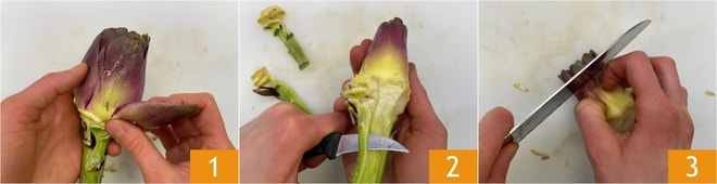 Pour préparer les paccheri avec artichauts, palourdes et poutargue, commencez par laisser dégorger les palourdes dans un bol avec de l'eau salée pendant quelques heures. Passez au Comment nettoyer les artichauts : éliminez les feuilles extérieures les plus dures 1, puis épluchez la tige avec un petit couteau 2 et coupez les pointes 3.
