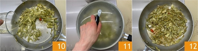 Déglacez avec le vin blanc 10 et laissez évaporer complètement, puis baissez le feu et laissez cuire avec le couvercle pendant une dizaine de minutes 11. Lorsque les artichauts sont cuits, éteignez le feu 12, retirez l'ail et le piment, et réservez.