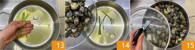 Pendant que les artichauts cuisent, occupez-vous des palourdes : dans une autre poêle, faites revenir un filet d'huile avec une gousse d'ail et les tiges de persil 13, puis ajoutez les palourdes égouttées de l'eau de trempage 14. Couvrez avec le couvercle 15 et faites cuire à feu vif juste le temps de faire ouvrir les coquilles.