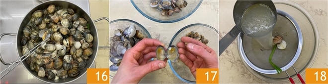 Au fur et à mesure qu'elles s'ouvrent, retirez les palourdes de la poêle 16. Décortiquez presque tous les mollusques en en laissant quelques-uns entiers pour la décoration 17. Filtrez le liquide de cuisson des palourdes 18 et réservez.