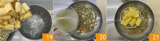 En attendant, portez à ébullition une casserole d'eau salée et faites cuire les paccheri al dente 19. Versez le liquide de cuisson des palourdes dans la poêle avec les artichauts 20, puis égouttez-y également les paccheri 21. Mélangez et terminez la cuisson des pâtes en ajoutant si besoin un peu d'eau de cuisson.