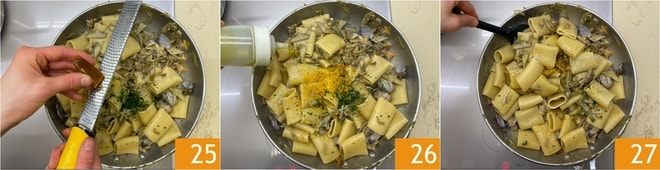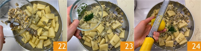 Enfin, ajoutez les palourdes décortiquées 22 et faites encore sauter le tout. Éteignez le feu et parfumez avec le persil haché 23 et le zeste de citron râpé 24.