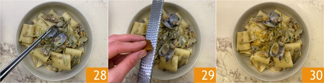 Dressez dans des assiettes et garnissez avec les palourdes entières mises de côté 28, puis complétez avec encore un peu de poutargue râpée 29. Vos paccheri avec artichauts, palourdes et poutargue sont prêts à être servis 30 !
