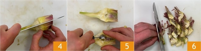 Coupez les artichauts en deux dans le sens de la longueur 4, puis retirez le foin 5 et coupez-les en fines tranches 6. Plongez au fur et à mesure les artichauts nettoyés dans un bol avec de l'eau acidulée pour éviter qu'ils ne noircissent.