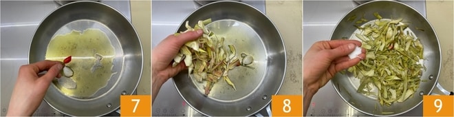 Dans une poêle, chauffez un filet d'huile avec une gousse d'ail et du piment 7, puis ajoutez les artichauts égouttés 8, salez 9 et faites revenir à feu moyen pendant quelques minutes.