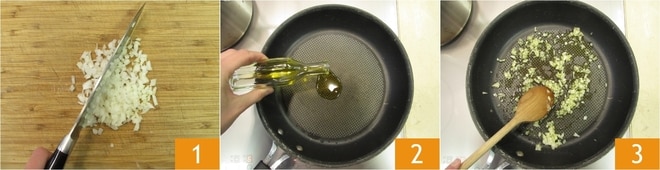 Pour préparer les paccheri aubergines et ricotta, commencez par mettre l'eau à bouillir pour les pâtes, à saler une fois à ébullition. Épluchez et hachez l'oignon 1, puis versez l'huile dans une grande poêle et faites chauffer 2. Ajoutez l'oignon 3 et faites-le revenir, en mélangeant de temps en temps pour le faire dorer et attendrir doucement.