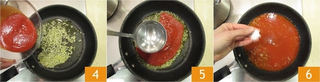 Versez la purée de tomates 4, ajoutez une louche d'eau chaude 5 et ajustez le sel 6.