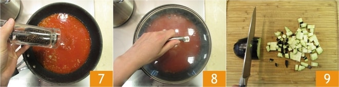 Assaisonnez de poivre à votre goût 7 et laissez cuire pendant 30 minutes avec un couvercle 8. Pendant ce temps, lavez, épluchez et coupez les aubergines en cubes d'environ un demi-centimètre 9.