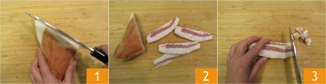 Pour préparer les paccheri crémeux au guanciale et aux pistaches, enlevez la couenne du guanciale 1, puis coupez-le d'abord en tranches 2 puis en lanières 3.