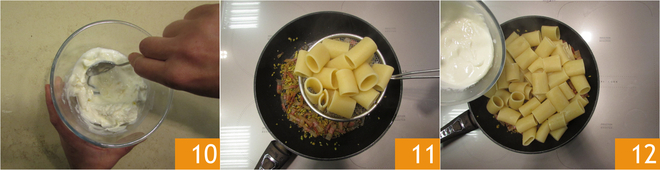 Mélangez pour l'assouplir 10. Égouttez les paccheri dans la poêle avec le guanciale et les pistaches 11. Ajoutez le fromage frais 12 et faites cuire en remuant à feu moyen pour lier.