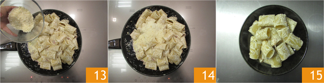 Ajoutez le Parmesan râpé 13 et mélangez 14. Servez immédiatement les paccheri crémeux au guanciale et aux pistaches 15.