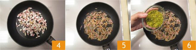 Mettez-le dans une poêle (sans ajouter d'huile) et faites-le dorer environ 10 minutes à feu moyen 4, en le retournant souvent avec une cuillère en bois. Une fois bien doré 5, ajoutez au guanciale les éclats de pistaches 6 et faites-les toaster environ 2 minutes.