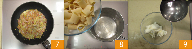 Réservez le guanciale rôti avec les éclats de pistaches 7. Mettez sur le feu une casserole remplie d'eau pour la cuisson des paccheri, à saler lorsqu'elle bout. Faites cuire les paccheri al dente, environ 7-8 minutes 8. Prélevez une louche d'eau de cuisson ou la quantité nécessaire 9 pour diluer le fromage frais.