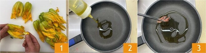 Pour réaliser les paccheri gratinés avec ricotta et fleurs de courgette, commencez par mettre sur le feu une casserole avec beaucoup d'eau salée pour cuire les pâtes, puis nettoyez les fleurs de courgette en enlevant la tige et le pistil 1. Dans une poêle, versez un filet d'huile 3 et faites fondre 2 filets d'anchois à l'huile 3.