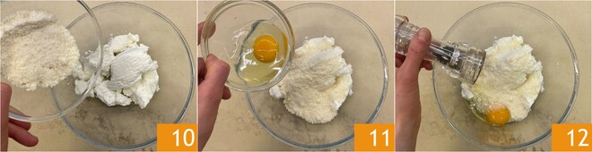 Mettez de côté et préparez la crème de ricotta : dans un bol, mélangez la ricotta, le Parmesan Reggiano AOP râpé 10, l'œuf 11, le sel et le poivre 12.