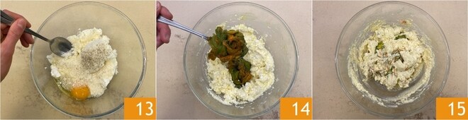 Amalgamez le mélange 13, puis ajoutez les fleurs de courgette 14 et mélangez à nouveau 15. Pour plus de commodité, vous pouvez transférer la crème de ricotta dans une poche à douille sans embout