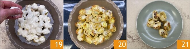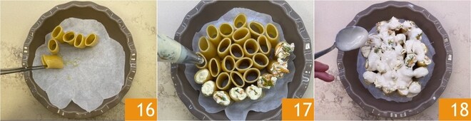Tapis une plaque avec du papier sulfurisé et placez les paccheri debout, les uns à côté des autres 16, puis remplissez chacun avec la farce 17. Parsemez la surface de béchamel 18.