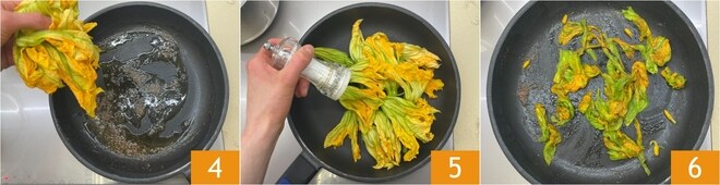 Ajoutez les fleurs de courgette 4, salez 5, poivrez et faites cuire pendant quelques minutes à feu moyen 6.