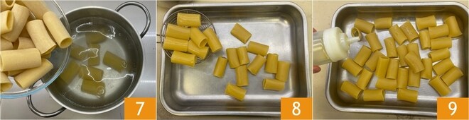 Entre-temps, l'eau sera arrivée à ébullition, salez et faites cuire les paccheri pendant environ 4 minutes 7. Égouttez les paccheri et transférez-les dans un plat à four 8, puis assaisonnez-les avec un peu d'huile pour éviter qu'ils ne collent 9.