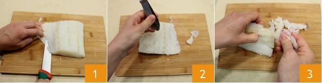 Pour préparer les paccheri farcis de morue sur fondue de fromage, commencez par nettoyer le poisson : prenez la morue dessalée et avec un couteau, retirez la peau 1; en passant bien le bout du doigt sur la chair, vérifiez la présence de petites arêtes résiduelles, puis enlevez-les avec une pince de cuisine 2. Une fois nettoyée et désarêtée, effilochez la morue avec les mains 3 et pendant ce temps, mettez sur le feu une grande casserole d'eau salée pour préparer le bouillon de légumes.