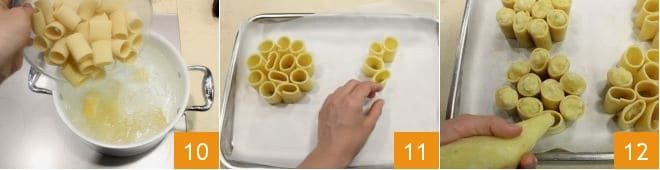 Mettez sur le feu une casserole avec une grande quantité d'eau salée qui vous servira pour la cuisson des pâtes. Lorsque l'eau frôlera l'ébullition, versez les paccheri 10 : faites-les cuire al dente, en faisant très attention lorsque vous les mélangez, car ils peuvent se casser facilement. Une fois prêts, égouttez-les, arrosez-les d'un peu d'huile pour qu'ils ne collent pas, puis disposez-les dans un plat à gratin en 4 tas de 10 paccheri chacun, posés verticalement 11 ; dans une poche à douille sans embout, mettez la farce à base de pommes de terre et morue que vous avez préparée et laissée tiédir, puis remplissez un par un les paccheri jusqu'à ras bord 12.