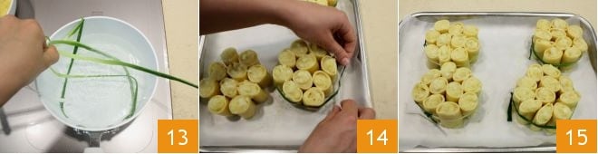 Dans une casserole pleine d'eau, blanchissez les fils d'un poireau de 45 cm 13 qui vous serviront à fermer les 4 tas de paccheri farcis 14. Passez les paccheri sous le grill pendant 5 minutes de manière à créer une belle croûte croustillante et ajoutez du poivre noir à votre goût 15.