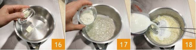 Entre-temps, préparez la fondue de fromage : faites tiédir le lait et à part dans une petite casserole à double fond, faites fondre le beurre 16 ; lorsque le beurre sera fondu, ajoutez la farine en pluie 17, en mélangeant bien jusqu'à ce que le roux soit bien doré. Versez le lait tiède 18, en mélangeant jusqu'à ce que la béchamel soit bien épaissie.