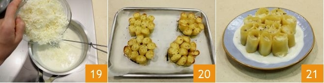 Ensuite, éteignez le feu et ajoutez l'Asiago râpé, en le laissant fondre 19. Une fois prêts 20, sortez les paccheri du four et procédez au dressage : versez quelques cuillères de fondue de fromage au fond de l'assiette et par-dessus, déposez un tas de paccheri. Enfin, vous pouvez servir et déguster les paccheri farcis de morue sur fondue de fromage bien chauds 21.