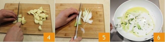 Lavez les pommes de terre sous abondante eau fraîche courante, épluchez-les et coupez-les en cubes 4. Émincez finement l'oignon nouveau 5, puis faites-le revenir sur le feu dans une poêle antiadhésive avec un filet d'huile, en ajoutant également les feuilles de thym 6.