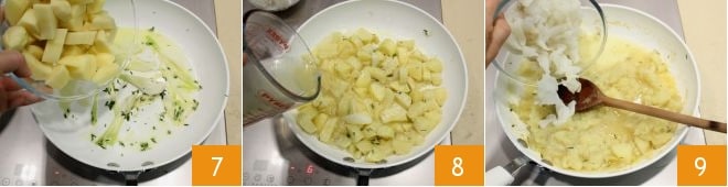 À ce stade, ajoutez les pommes de terre coupées en cubes 7, faites-les dorer et recouvrez avec le bouillon de légumes que vous avez préparé 8 ; laissez cuire pendant 15 minutes, en ajustant le sel et le poivre à votre goût. Ensuite, ajoutez la morue, en continuant la cuisson pendant encore 5-6 minutes 9. Une fois prête, transférez la préparation dans un bol, écrasez-la avec une fourchette pour obtenir une purée douce et laissez tiédir.