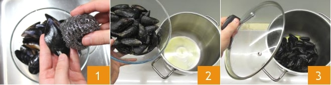 Pour préparer la paella de marisco, commencez par préparer le Fumet de crustacés en suivant notre recette, il vous en faudra 750 g. Ensuite, occupez-vous du nettoyage des moules : retirez les balanes avec un couteau, détachez le byssus et grattez les coquilles avec une éponge métallique 1, en rinçant soigneusement les coquilles sous l'eau courante. Faites chauffer un filet d'huile dans une casserole, puis ajoutez les moules 2 et couvrez avec le couvercle 3.