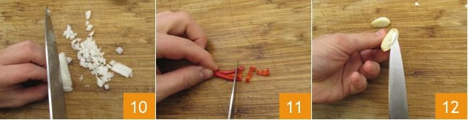 Préparez également les autres ingrédients dont vous aurez besoin pour la préparation : épluchez et hachez finement l'oignon 10, puis retirez les graines du piment et coupez-le finement 11. Enfin, épluchez la gousse d'ail, coupez-la en deux et retirez le germe interne 12.