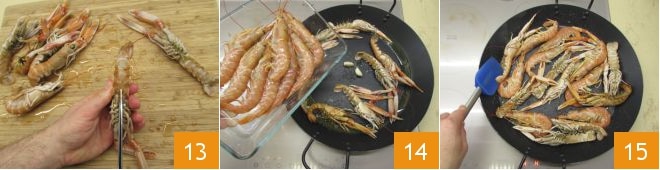 En ce qui concerne les crevettes et les langoustines, rincez-les sous l'eau courante et incisez-les en pratiquant une coupe le long du ventre avec une paire de ciseaux : elles dégageront ainsi plus de saveur pendant la cuisson 13. Dans la poêle spécifique à paella, faites chauffer un filet d'huile avec la gousse d'ail, puis ajoutez les crustacés 14 et faites-les dorer pendant 1 à 2 minutes de chaque côté à feu vif 15.