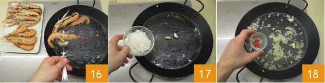Une fois cuits, transférez les crevettes et les langoustines dans une assiette et réservez-les 16. Dans la même poêle, ajoutez l'oignon 17 et faites-le fondre à feu doux pendant quelques minutes, en ajoutant également le piment 18.