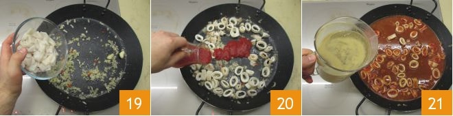 À présent, augmentez légèrement le feu et ajoutez les calamars 19. Après quelques minutes, retirez l'ail et versez la sauce tomate 20. Ajoutez également le fumet chaud 21