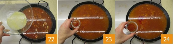 et le liquide des moules que vous avez mis de côté 22. Assaisonnez avec le safran 23 et le paprika 24, mélangez et portez à ébullition.
