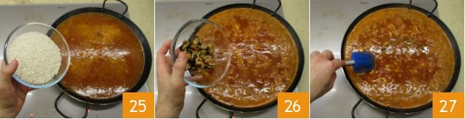 Lorsque le liquide a atteint l'ébullition, vous pouvez ajouter le riz 25 et les moules décortiquées 26, puis poivrez et salez avec modération, car l'eau des moules et le fumet de crustacés sont déjà assez salés. Remuez une dernière fois 27 et faites cuire à feu doux pendant environ 18 minutes, ou pour le temps indiqué sur l'emballage : le riz doit cuire par absorption, il ne faudra donc plus le mélanger mais vous pourrez simplement secouer délicatement la poêle de temps en temps.