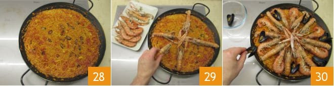 Une fois le temps de cuisson écoulé, le riz doit être sec et partiellement collé au fond de la poêle 28. À ce stade, éteignez le feu et disposez les crustacés sur la surface 29, puis ajoutez également les moules avec les coquilles que vous aviez réservées 30. Votre magnifique paella de marisco est prête à être servie !