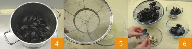 Faites-les cuire pendant 4-5 minutes à feu vif en secouant la casserole de temps en temps, elles s'ouvriront ainsi 4. Éteignez le feu et égouttez les moules dans un bol sur lequel vous aurez placé une passoire, afin de filtrer et de conserver leur liquide de cuisson qui vous servira plus tard 5 ; il vous en faudra 250 g. Décortiquez la majorité des mollusques et réservez-en quelques-uns entiers pour la décoration finale 6. Éliminez les moules qui ne se sont pas ouvertes.