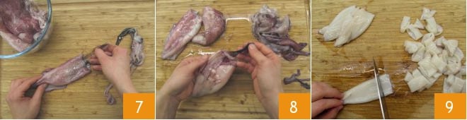 Passons maintenant au nettoyage des calamars : retirez la plume 7 et le bouquet avec les entrailles attachées, puis enlevez également la peau 8. Rincez soigneusement l'intérieur des calamars, puis coupez-les en rondelles de quelques centimètres 9.