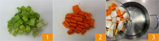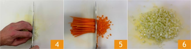 Entre-temps, émincez finement l'oignon 4, la carotte 5 et le céleri 6.