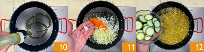 Dans une grande poêle (de préférence une poêle à paella), versez un filet d'huile 10 et ajoutez l'oignon, l'ail et la carotte. Ajoutez également une gousse d'ail en chemise 11 et faites revenir quelques minutes. Ajoutez ensuite les courgettes dans la poêle 12.