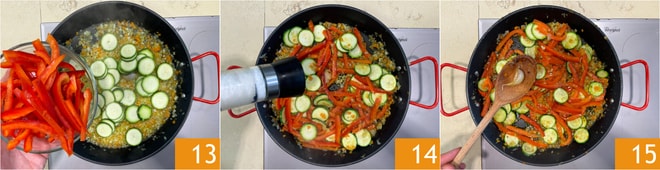 Ajoutez les poivrons 13 et assaisonnez de sel et de poivre 14. Faites cuire quelques minutes, jusqu'à ce que les légumes soient légèrement cuits. Retirez l'ail 15.