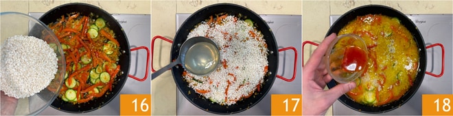 Ajoutez le riz 16 et faites-le griller, en remuant bien, pendant 2 minutes. Mouillez avec le bouillon de légumes 17 en quantité suffisante pour couvrir tout le riz. Entre-temps, dissolvez le safran avec un peu d'eau ou de bouillon et ajoutez-le dans la poêle 18.